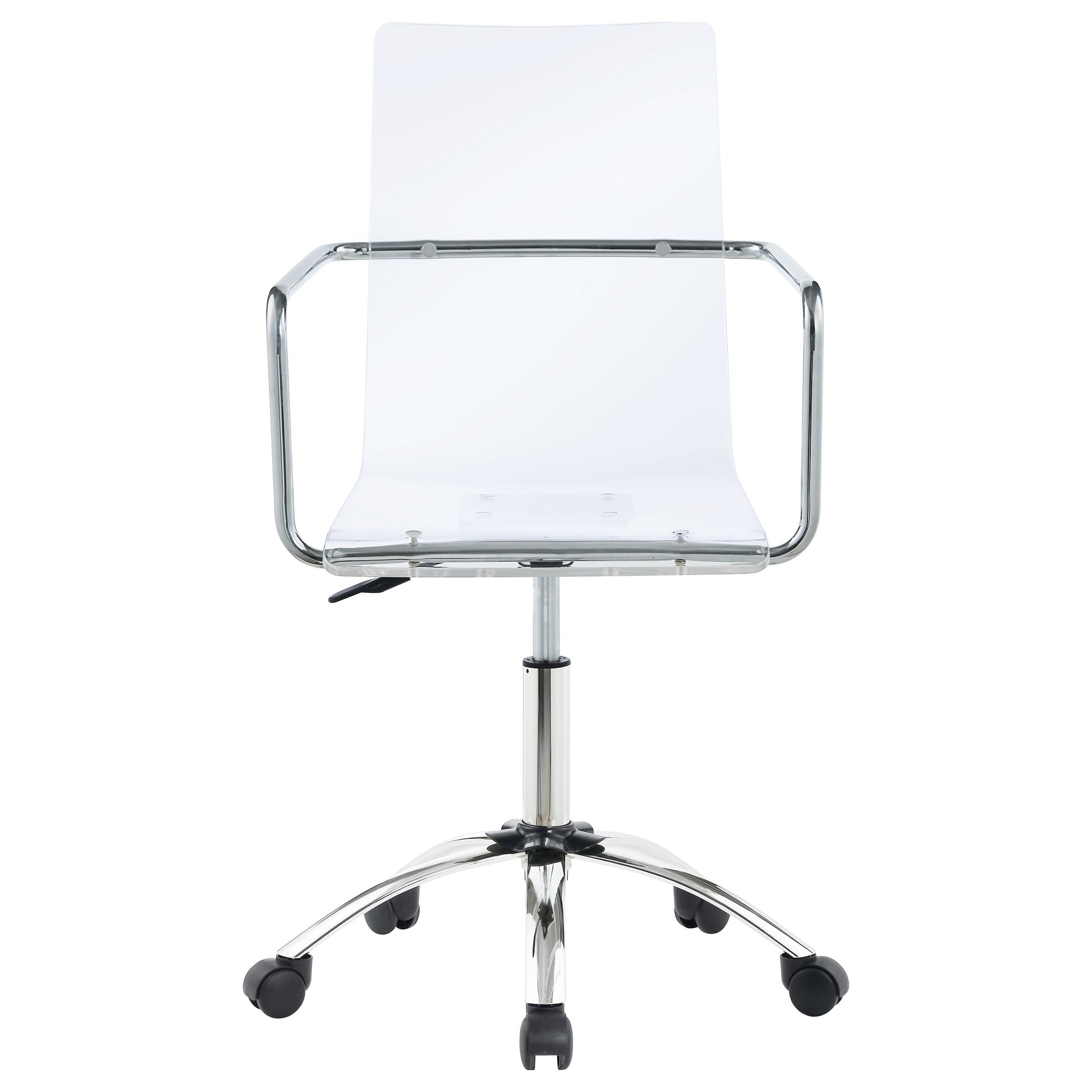Showcase modern sophistication with this ultra-chic office chair designed to elevate any workspace. A clear molded acrylic seat and back create a stunning, minimalist aesthetic, while the chromed metal base offers both durability and shine. Smooth caster wheels and adjustable seat height provide functional ease, making this chair as practical as it is stylish.
