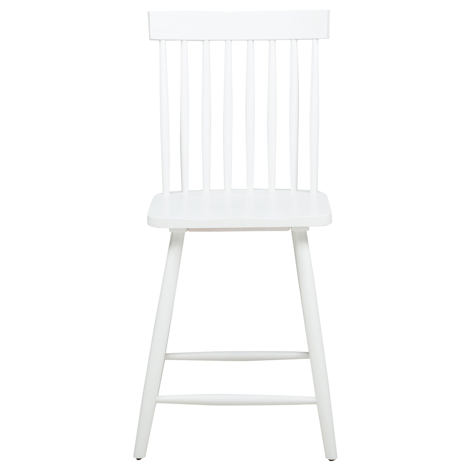 Classic and casual with a fresh farmhouse flair, this Windsor-style counter height chair features a high spindle back and gently contoured seat for timeless comfort. The clean silhouette is crafted from solid rubberwood with a rich wood veneer that enhances its natural grain. Angled legs with double stretchers offer reliable support and charm. Ideal for kitchen islands, pub tables, or counter-height dining spaces.