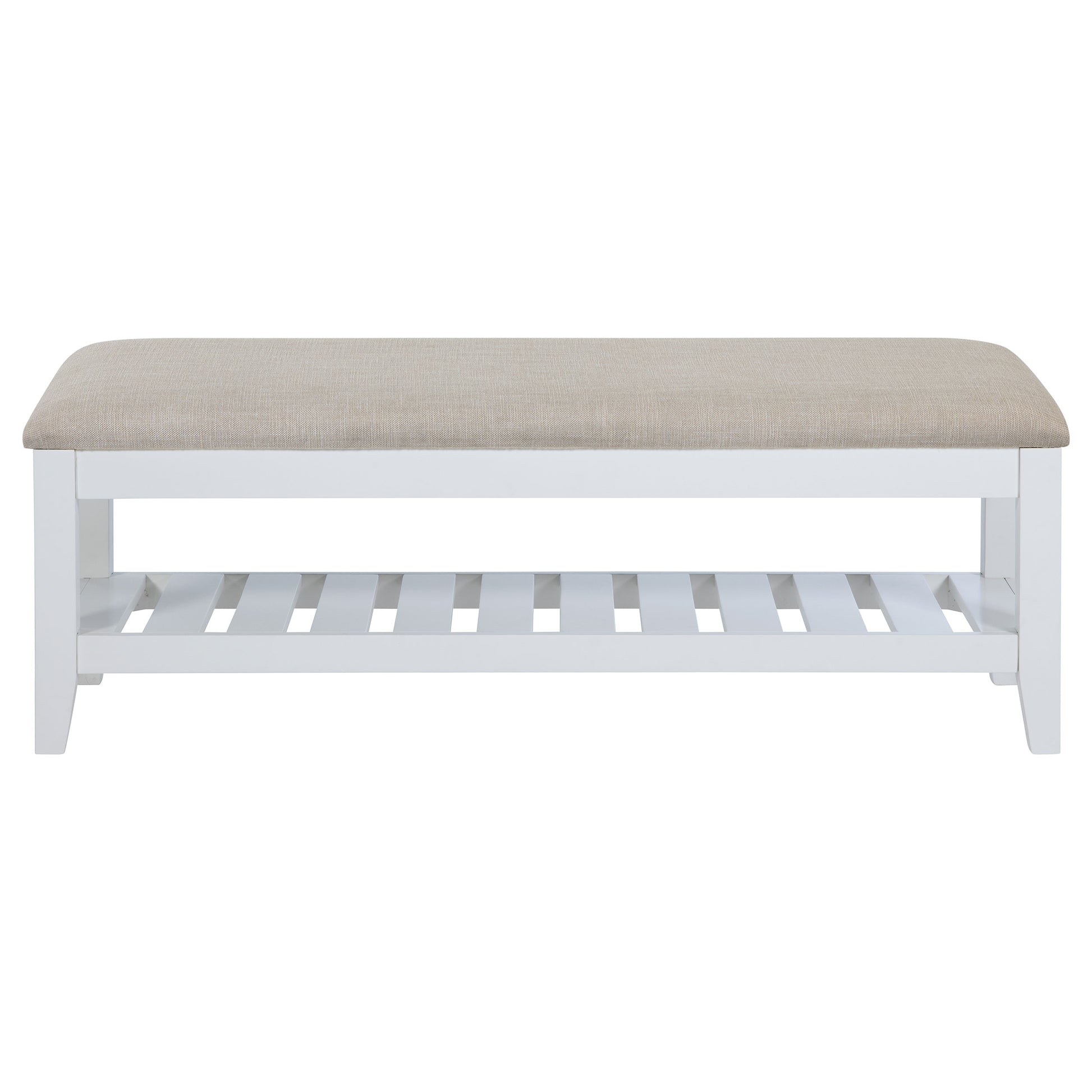 This sleek and versatile bench brings a touch of timeless elegance to any room. Its beige upholstered, foam-padded seat offers exceptional comfort while the sturdy wooden frame, finished in white, ensures long-lasting durability. A slatted shelf beneath the seat provides practical storage for shoes or other essentials, making it perfect for entryways or bedrooms. The clean lines and simple design make it a fitting addition to both modern and classic interiors. Its thoughtful construction delivers both functionality and an understated, stylish charm.