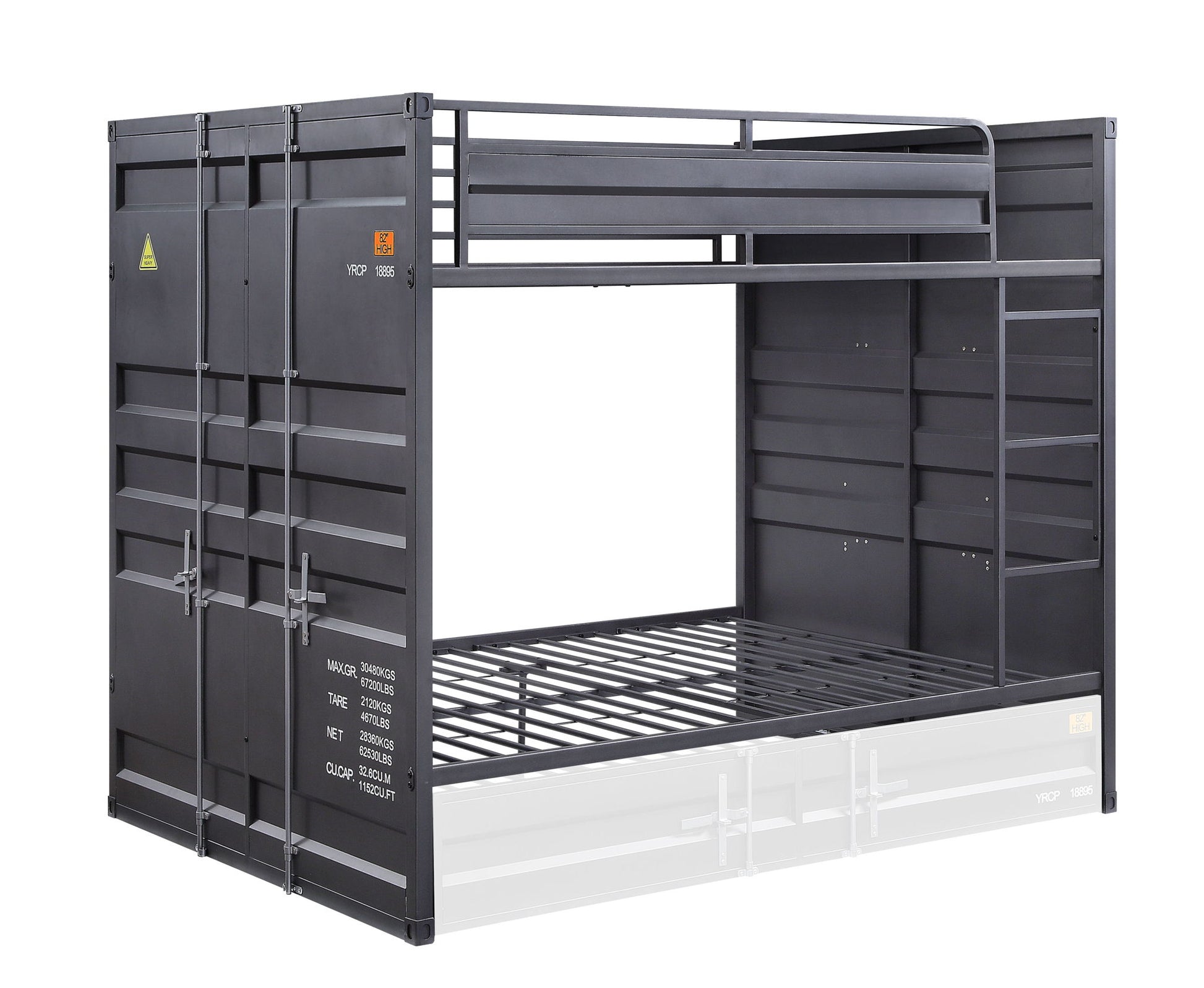 The Cargo bunk bed and trundle is the perfect addition to any child's room. This contemporary container themed metal bunk bed is crafted with an industrial look that is an ideal addition to your bedroom. The bed is accented with recessed panel design and locks in an understated finish. This fashionable bed will accent your other bedroom furniture, transforming a room from ordinary into something playful and unique.