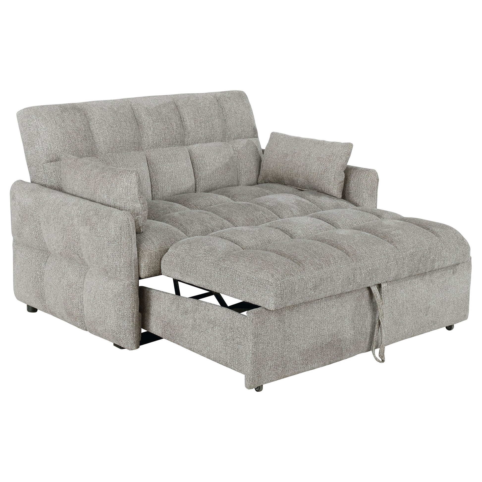 Bring versatility and comfort into your living space with this convertible sleeper sofa. Upholstered in soft chenille with all-over tufting, it combines cozy seating with a modern profile. Slim track arms and a rectangular backrest lend clean lines and contemporary appeal. The back folds flat for an easy transition into sleeping space, while a pull-out mechanism extends the lounge into a bed for guests. Crafted with a kiln-dried hardwood frame, sinuous spring decking, and high-resilience foam, it offers long-lasting comfort and support.