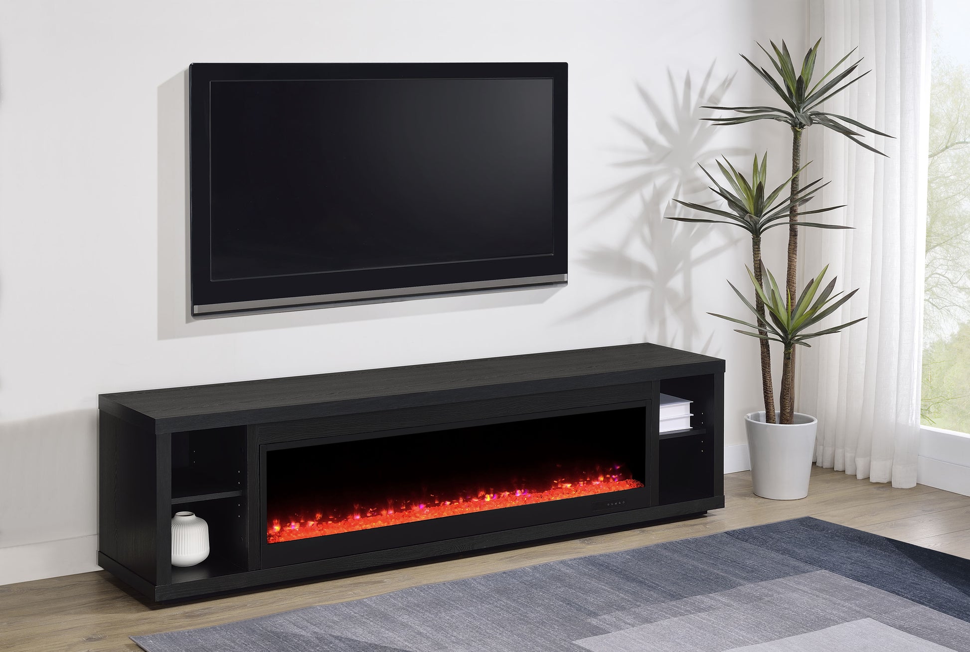 This sleek fireplace media console brings warmth and streamlined storage to contemporary living spaces. A wide electric firebox glows over crushed acrylic crystals, offering fifteen customizable flame colors operated by a wireless remote. Open side compartments with adjustable shelves store devices or dΓ©cor, while rear cable management cutouts keep wires out of sight. Finished in classic black and crafted from engineered wood with a laminate veneer, it serves as a refined TV stand or entertainment center. Please note that this console does not include a heat function.