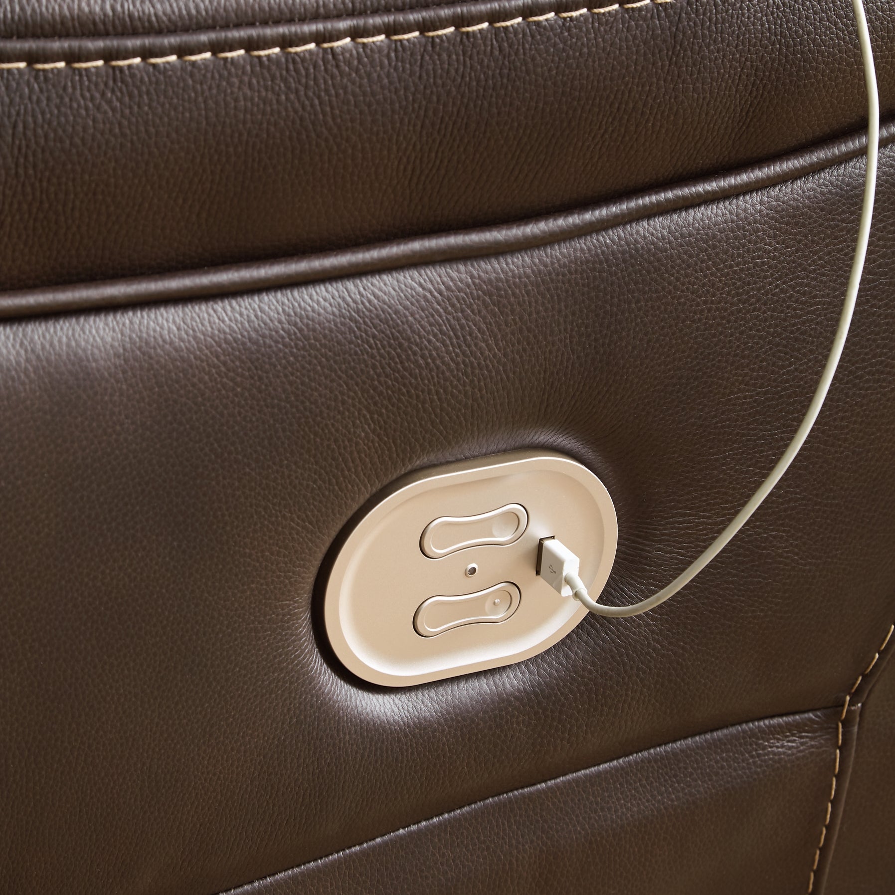 Load up on comfort in a cool, clean-lined and contemporary way with this zero wall recliner with power headrest. Rest assured, the expertly matched leather and faux leather upholstery is enriched with a pebble grain effect for authentic appeal and enhanced with jumbo stitching for dramatic contrast. It features a one-touch power control with adjustable positions and includes an Easy Viewโข adjustable headrest that allows a primo view of the TV even when you're reclined. The extended ottoman provides extra length for leg comfort. A zero-draw USB plug-in at your fingertips lets you charge up as you chill out.