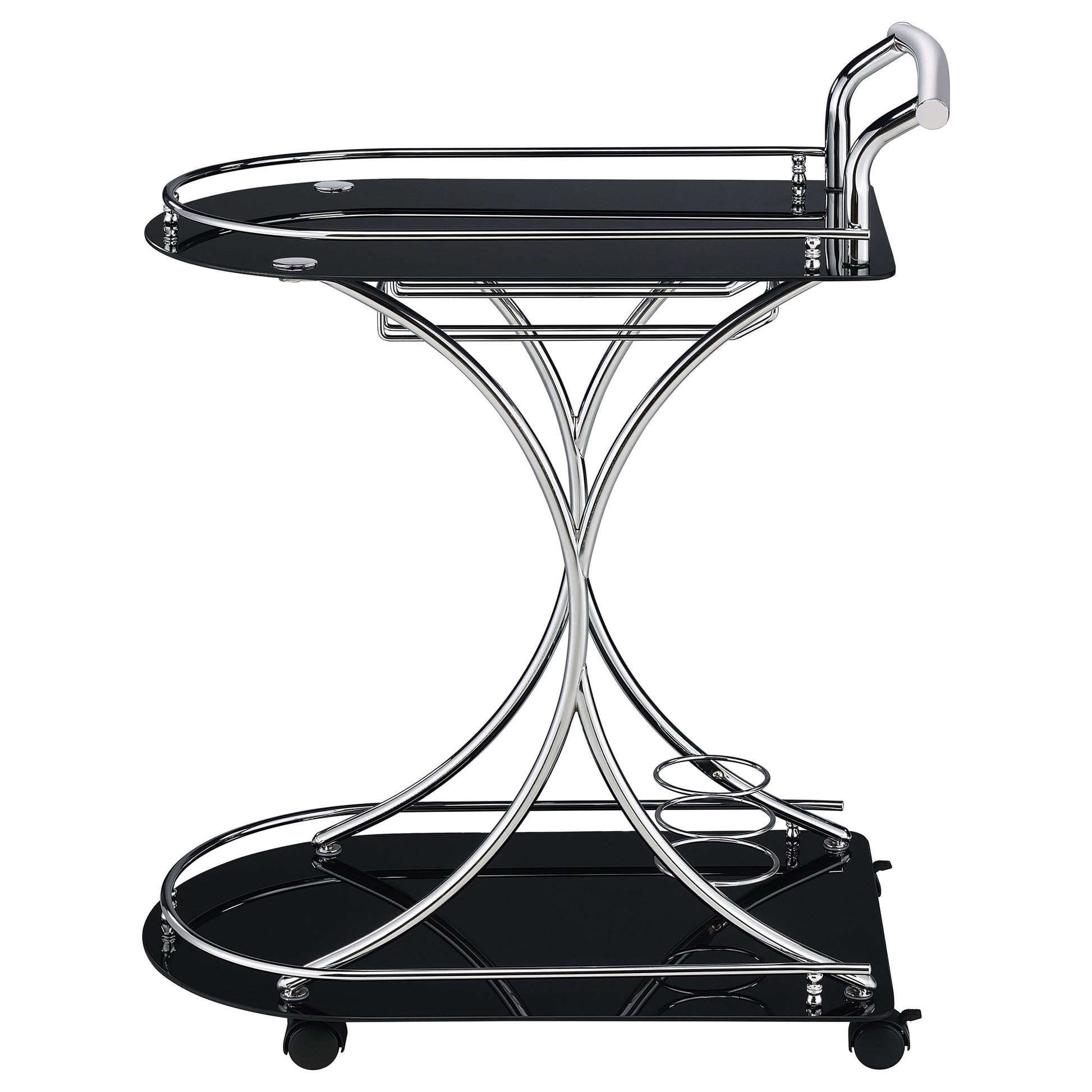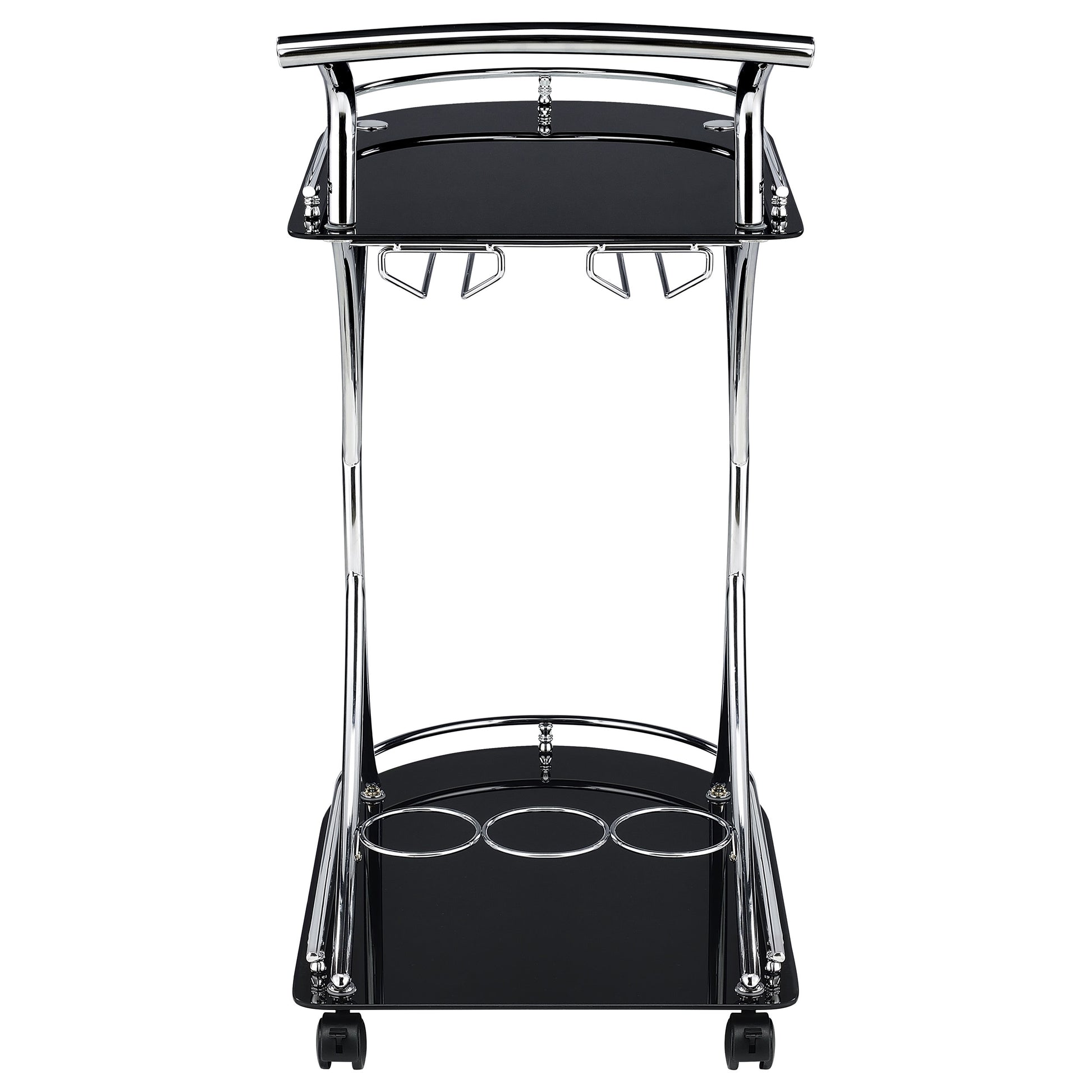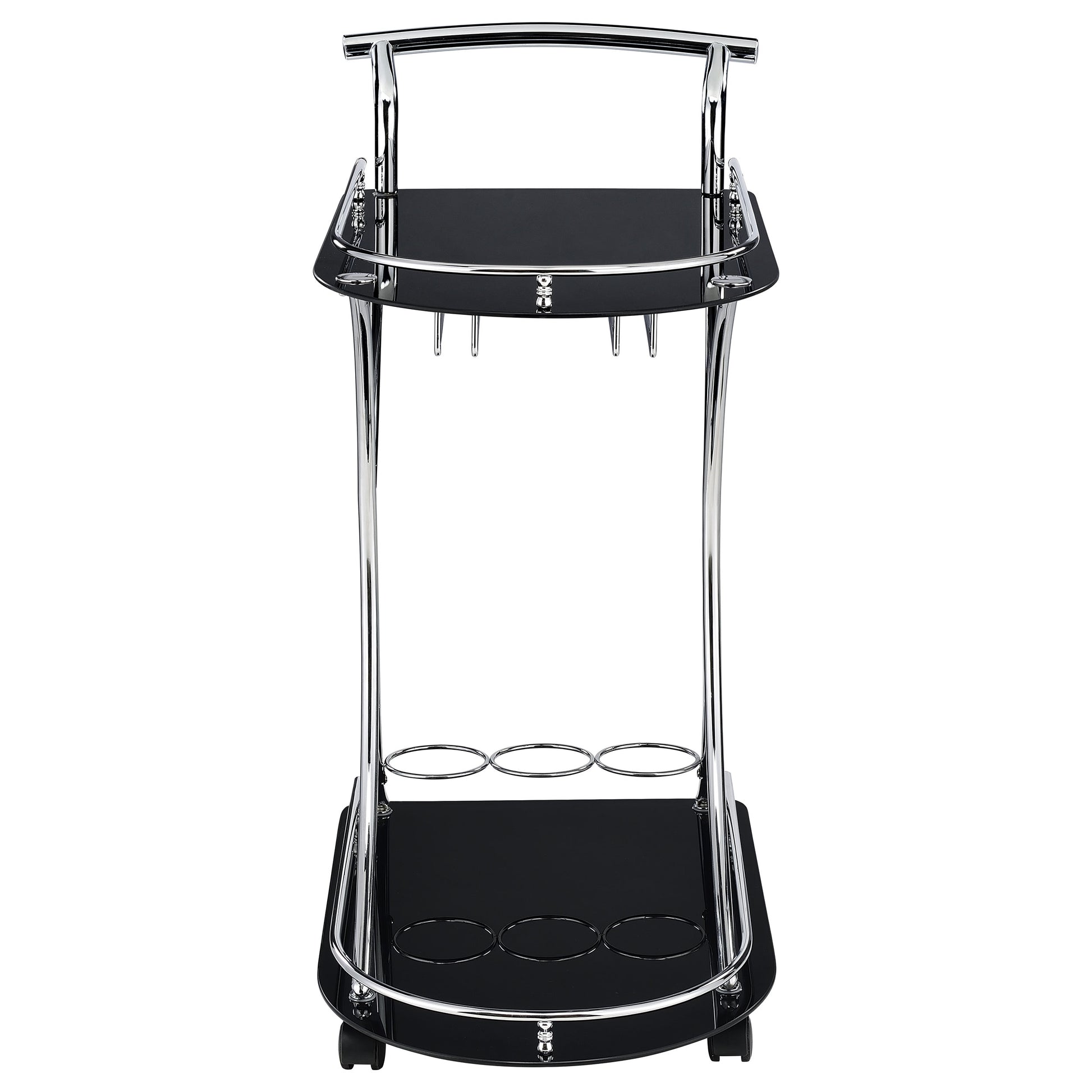 Recapture mid-century elegance with an enticing function. Slender construction elements form a graceful look in this mobile serving cart and add a lovely accent piece that's also useful for entertaining. Sleek black glass serves as a top and bottom shelf, contributing to an upscale flavor. Chrome finish metal accents round out a luscious palette. Serve and store with a pair of wine bottle holders and a stemware rack.