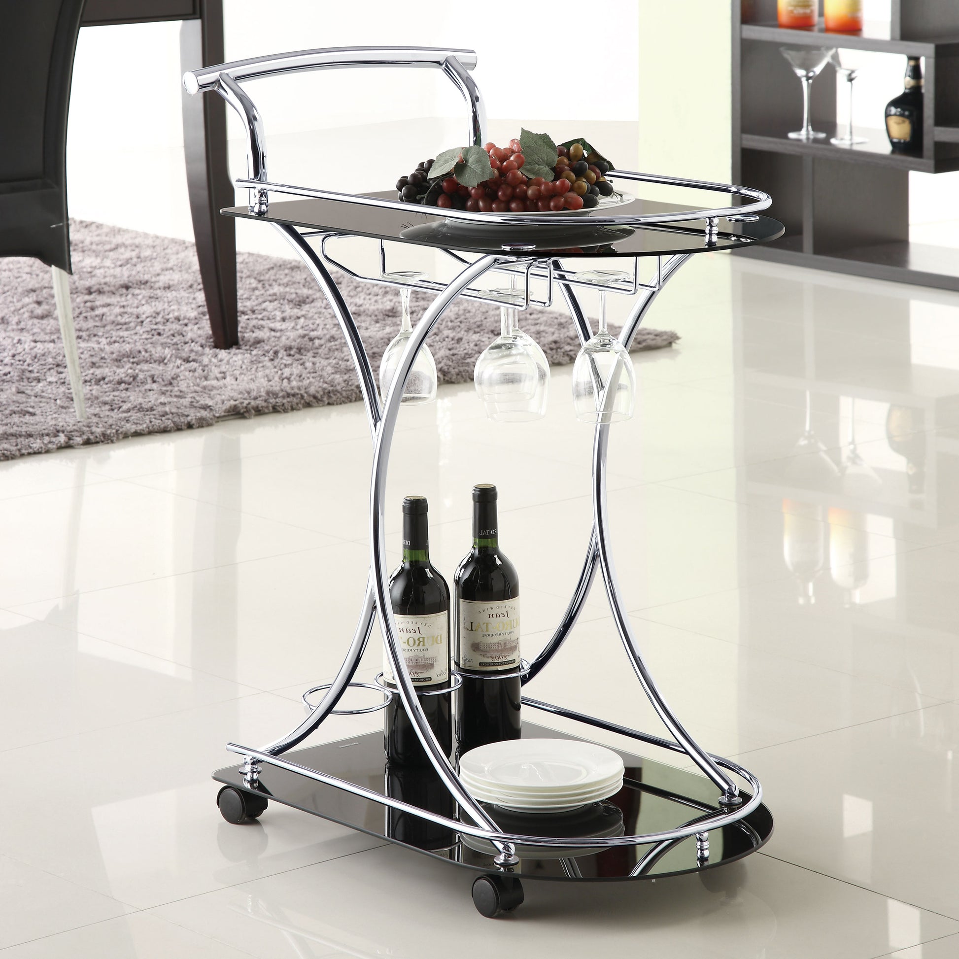 • Two-tier bar cart with black tempered glass shelves and chrome metal frame