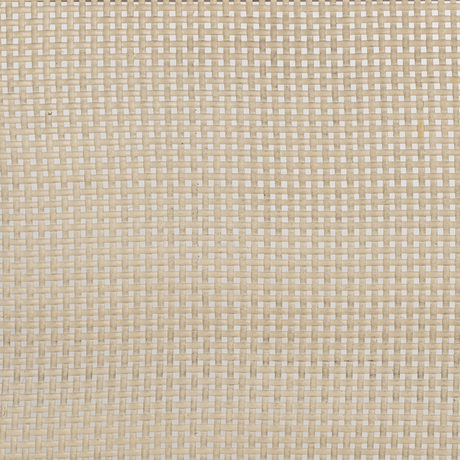 • Chairs feature hand-woven radio weave cane backrests and foam seat cushions upholstered in beige fabric