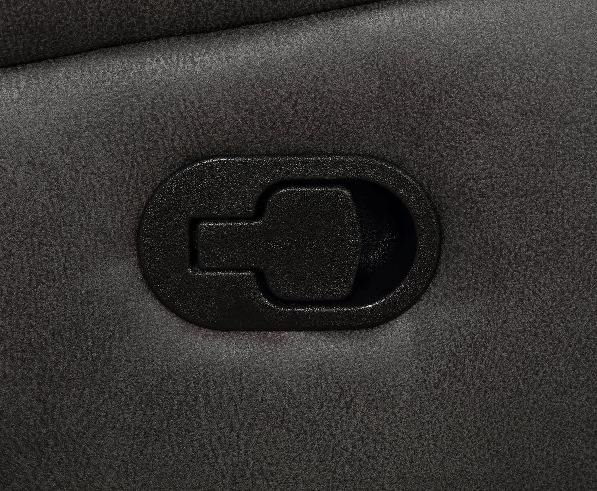 β’ Glider recliner in charcoal microfiber with padded arms and supportive tufted back