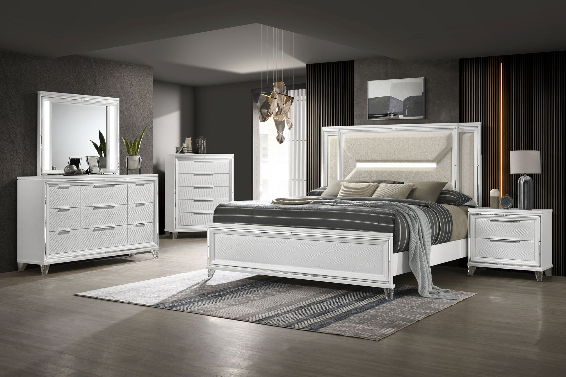 Add a touch of elegance to your bedroom with this spacious 9-drawer dresser, featuring a modern Italian design. The white finish, combined with picture framed recessed panels and embossed herringbone graphic patterns, creates a sophisticated look. Accented with mirror framing, acrylic legs, and polished chrome metal hardware, this dresser offers ample storage space. The top center drawer includes a removable jewelry tray, and all top drawers are felt-lined for added luxury. Crafted from rubberwood, MDF, and mirror, this dresser combines style and practicality.