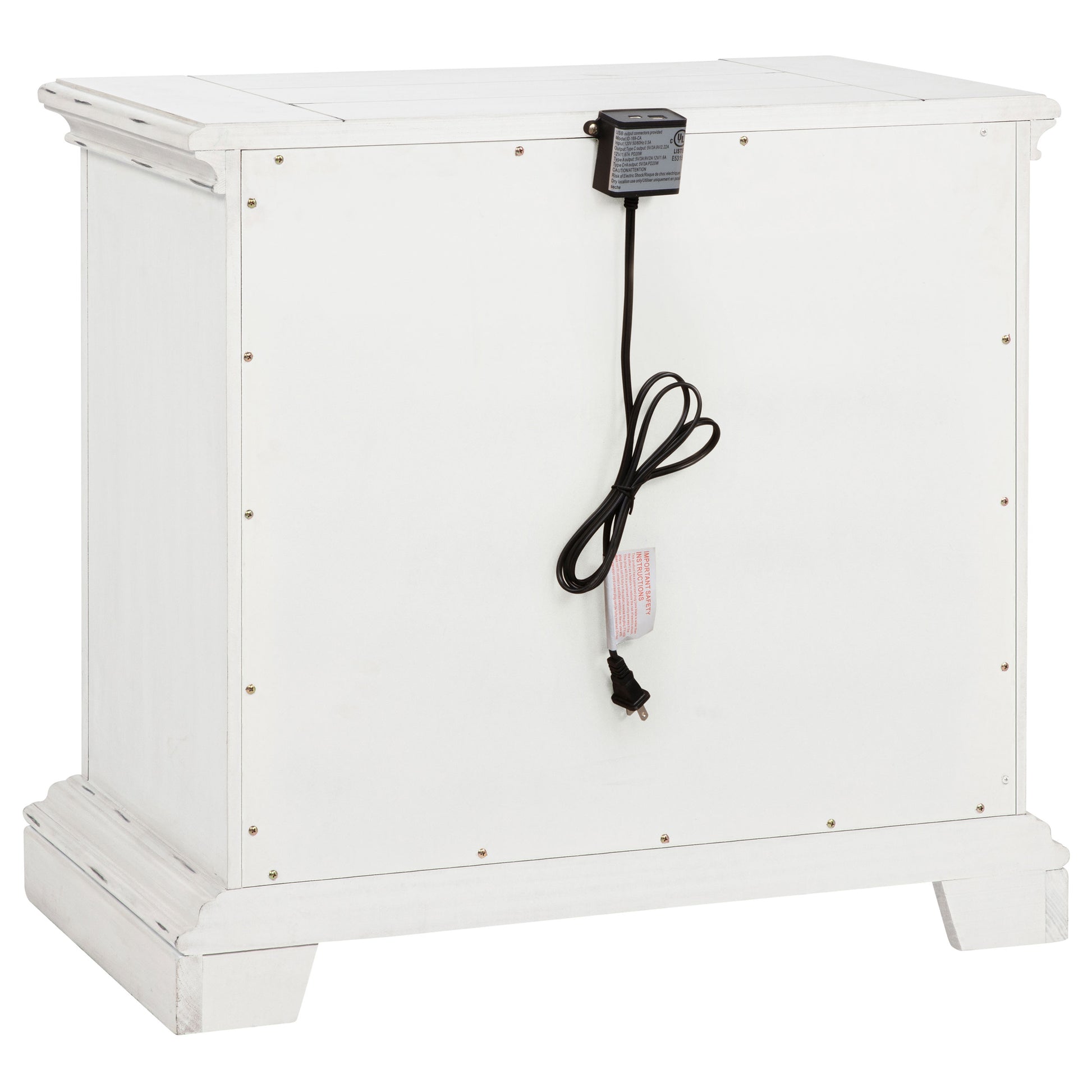 Charming and functional, this two-drawer nightstand blends classic design with thoughtful details. A vintage white finish softens the ornate carvings and sculpted base, while antique bronze handles bring graceful contrast. Dual USB ports are hidden at the back for modern convenience, while felt-lined drawers offer protected storage. Built from poplar and engineered wood, it balances timeless beauty with everyday function.