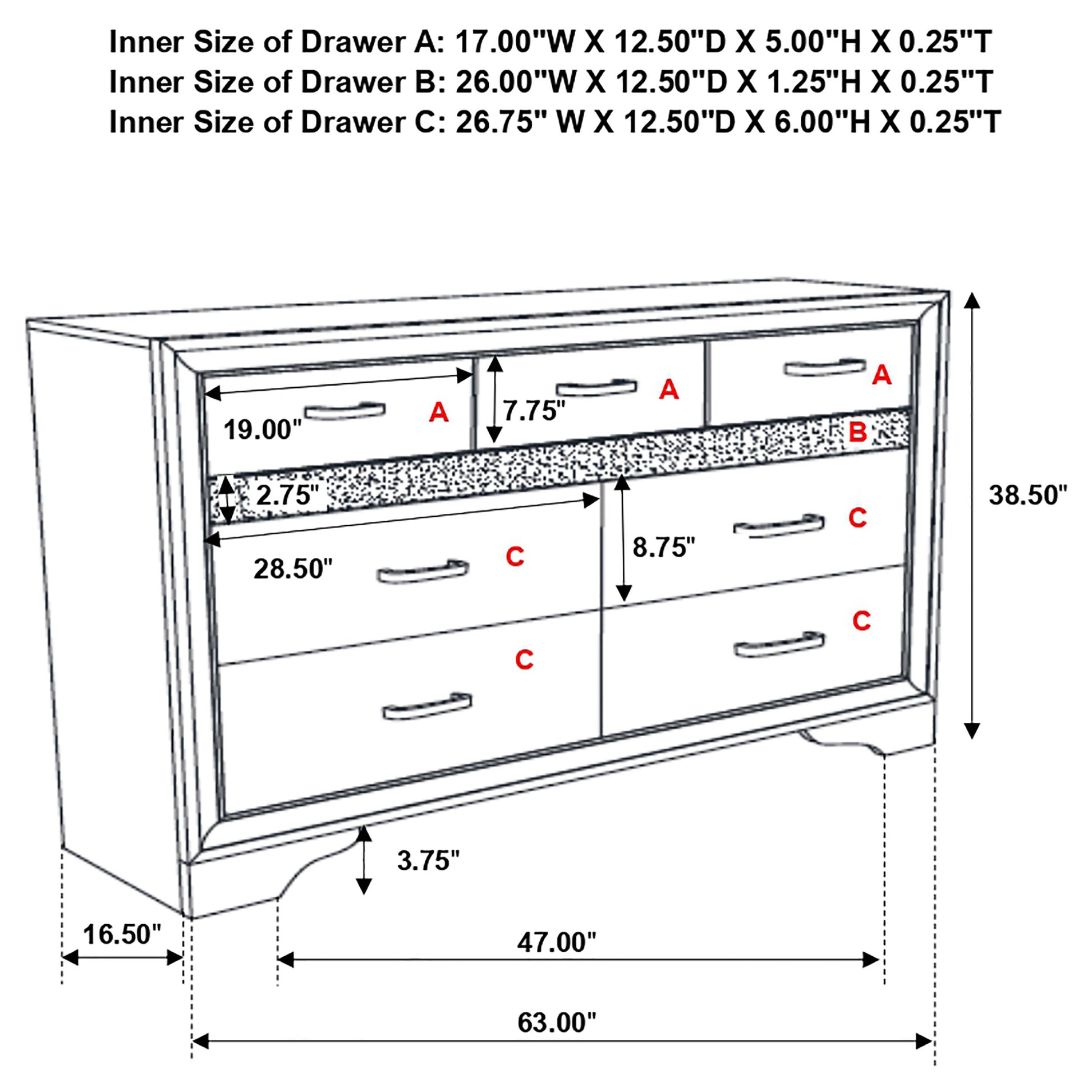 Infuse your space with sophisticated grace. The chic design of this beautiful dresser lends a touch of elegance to any bedroom. Felt-lined drawers keep delicate belongings safe and secure. A hidden jewelry drawer offers a discreet place to store your valuables. Complete with a glittery panel across the front, this piece exudes sparkling opulence.
