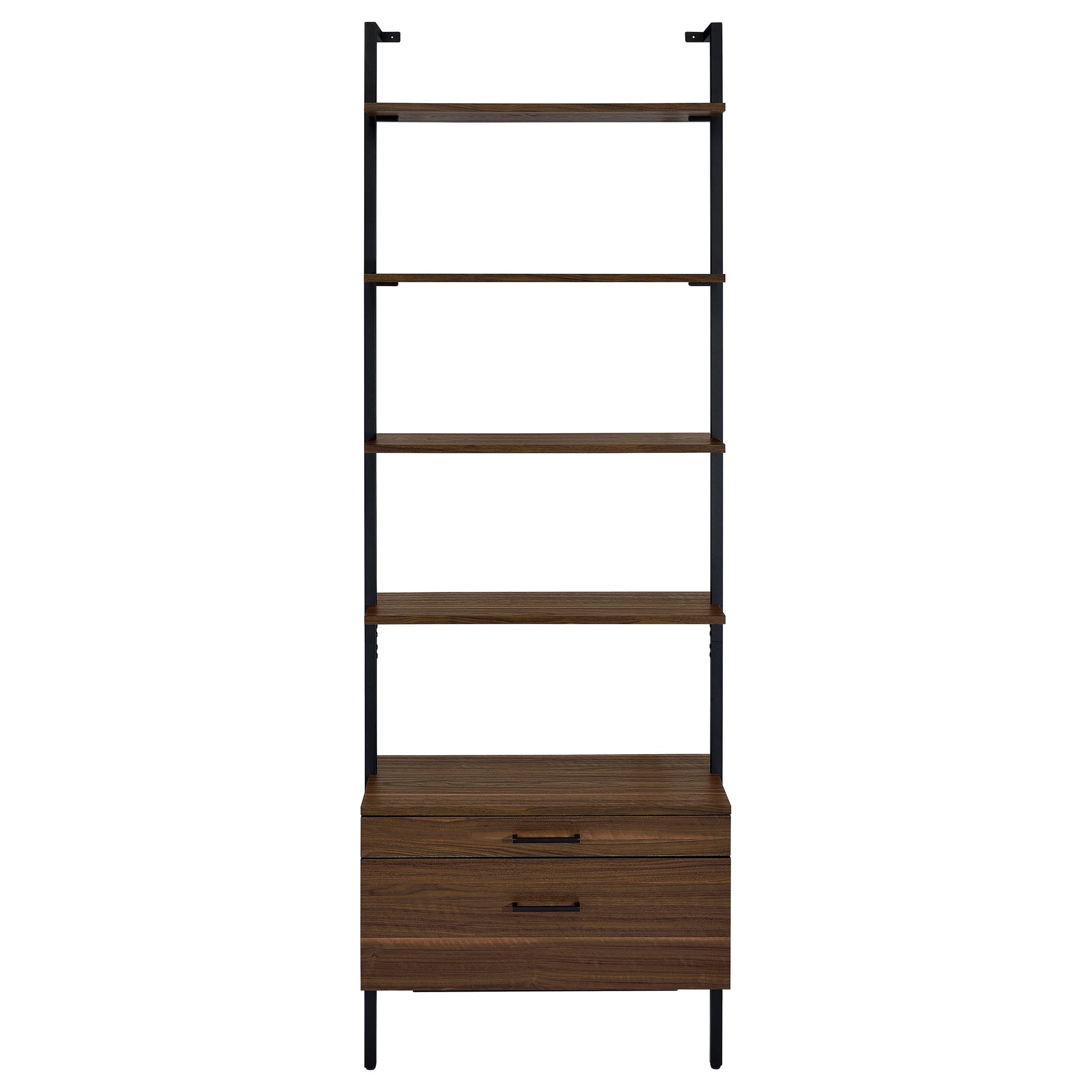 Play up the light, airy ambiance of a modern space while making use of every inch with a modern wall bookcase. It features four floating upper shelves and a lower case with two drawers, perfect for a blend of storage and display in any room. The shelves and two drawers feature a warm walnut finish over melamine paper, offering durability for a lovely look that lasts. A black finish metal frame supports the bookcase, offering neutral appeal in any setting. Stash essentials in the drawers while adding decor to shelves for a personal look and feel.