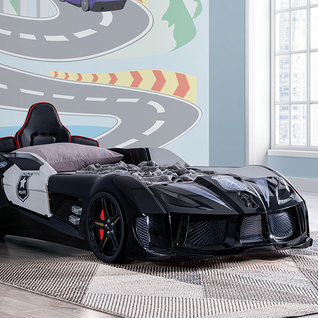 This is what dreams are made of! Create a fun-filled kids room with this sleek and comfy twin bed. A stylish interpretation of the real patrol cars, it features magnetic doors that swing open and upholstered headboard shaped like a car seat. Use the included remote control to pick one of the four possible sound effects while you fill the room with ambient lighting from embedded LED lights in the wheels. Headlights serve as night lights for those intimate, bedtime stories.