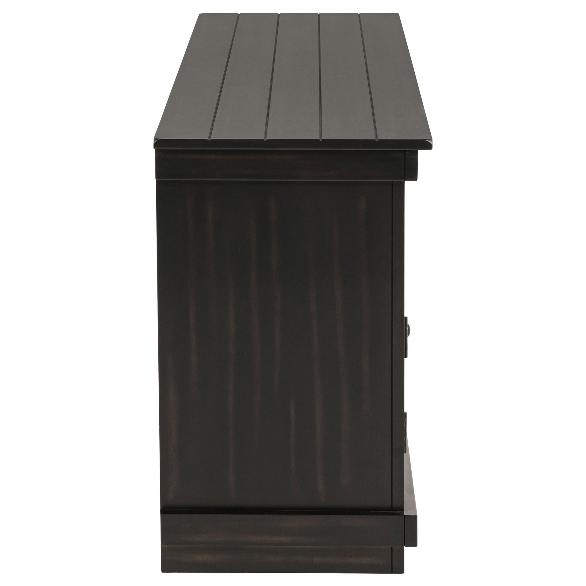 Complete a media center in your inviting home with a modern farmhouse TV stand. It's an approachable design with roughhewn wood details that create texture and dimensionality in your living space. Two shelves and six compartments create ample storage, perfect for everything from peripherals and accessories to personal decor. The media console features a clean-lined silhouette with a slim profile, perfect for a flat panel or wall-mounted television. This TV stand accommodates televisions up to 65 inches.