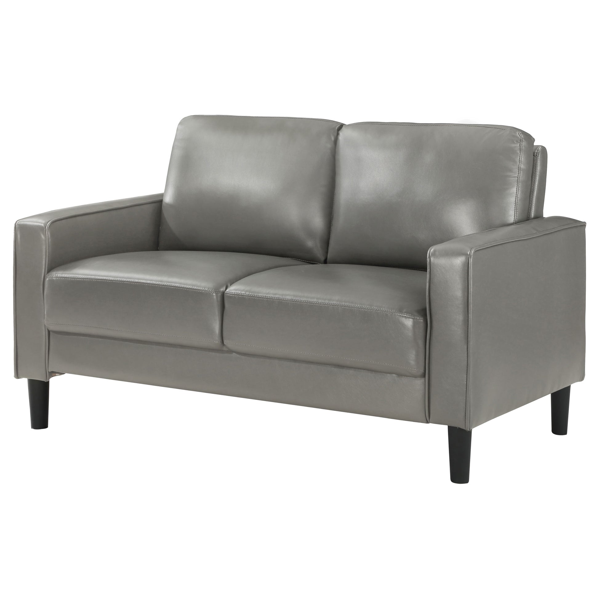A compact profile makes this modern loveseat the perfect choice to add seating in a living room or den. It’s a structured silhouette complete with track arms. Faux leather upholstery is supple and smooth, offering contemporary style and sophistication that impresses without overwhelming. Plush cushions provide wonderful comfort for lounging, with sinuous spring decking under seats and a webbed back. Tapered, straight legs offer a chic finishing touch, providing support and stability.