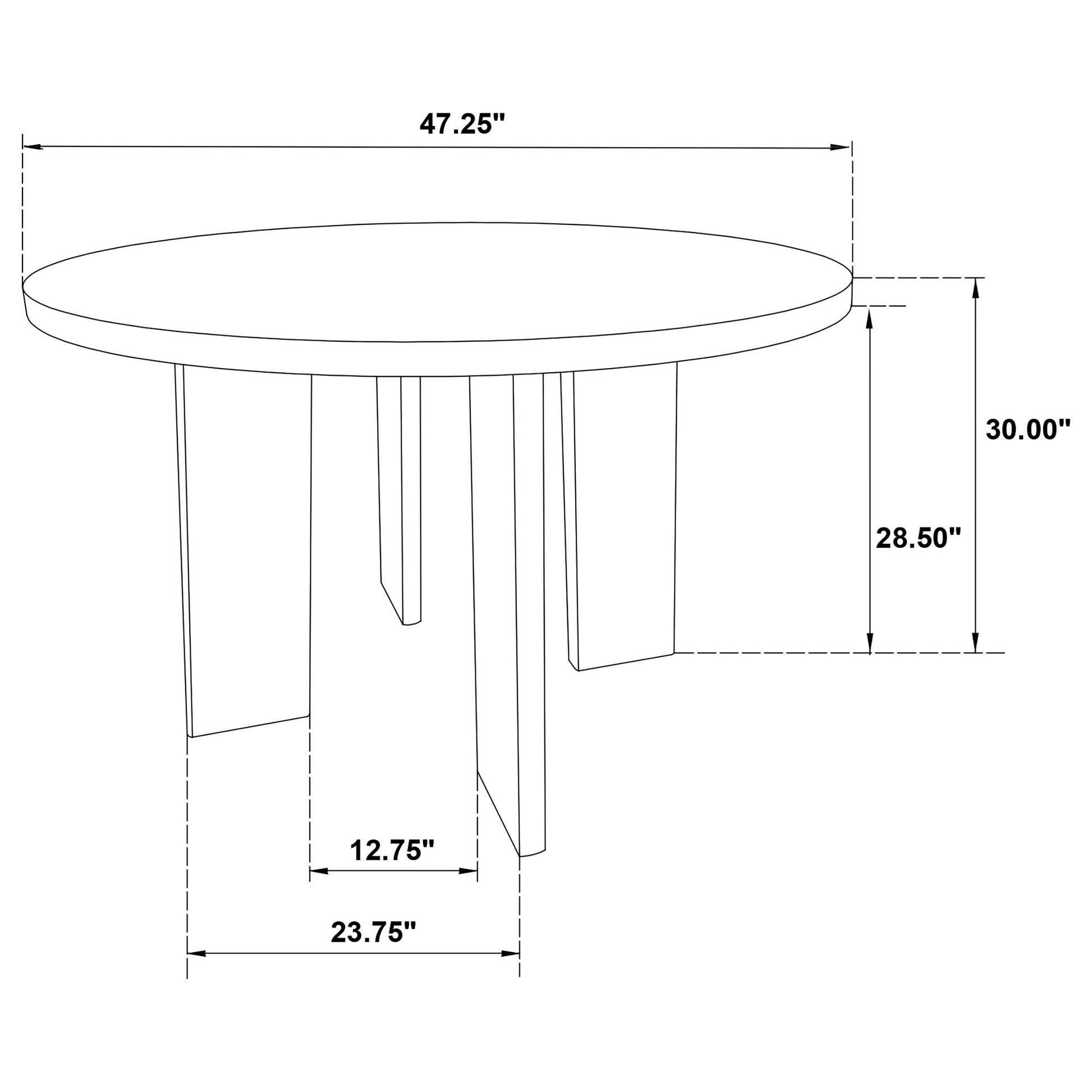 Five-piece dining set pairs a sculptural round pedestal table with tailored upholstered seating for a balanced dining room look. The circular tabletop rests on an open panel base that gives the table architectural depth, while the side chairs add cushioned seats and supportive backs with a clean armless profile. Ash veneer surfaces pair with rubberwood and engineered wood, while the chairs bring foam padding and polyester upholstery. Its round layout supports comfortable conversation for everyday dining and gathering.