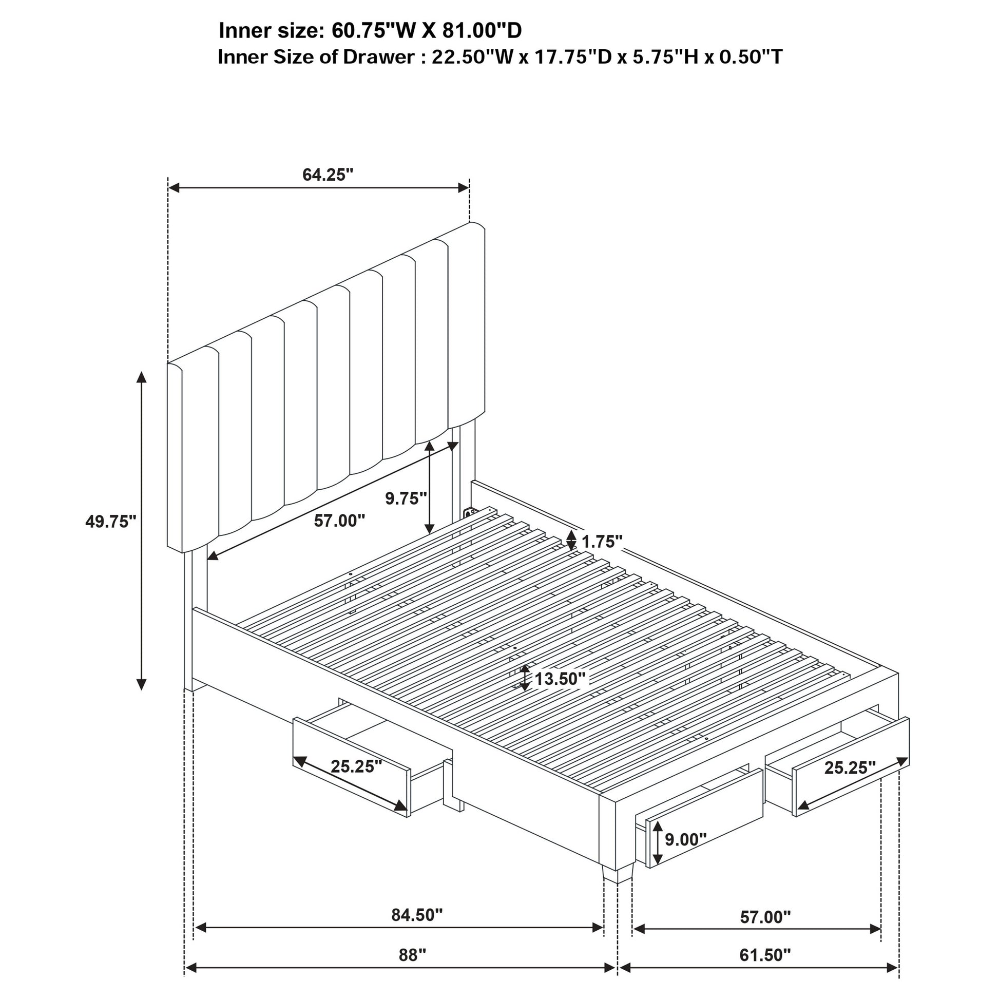 β’ Four drawers integrated into the base for discreet side and footboard storage