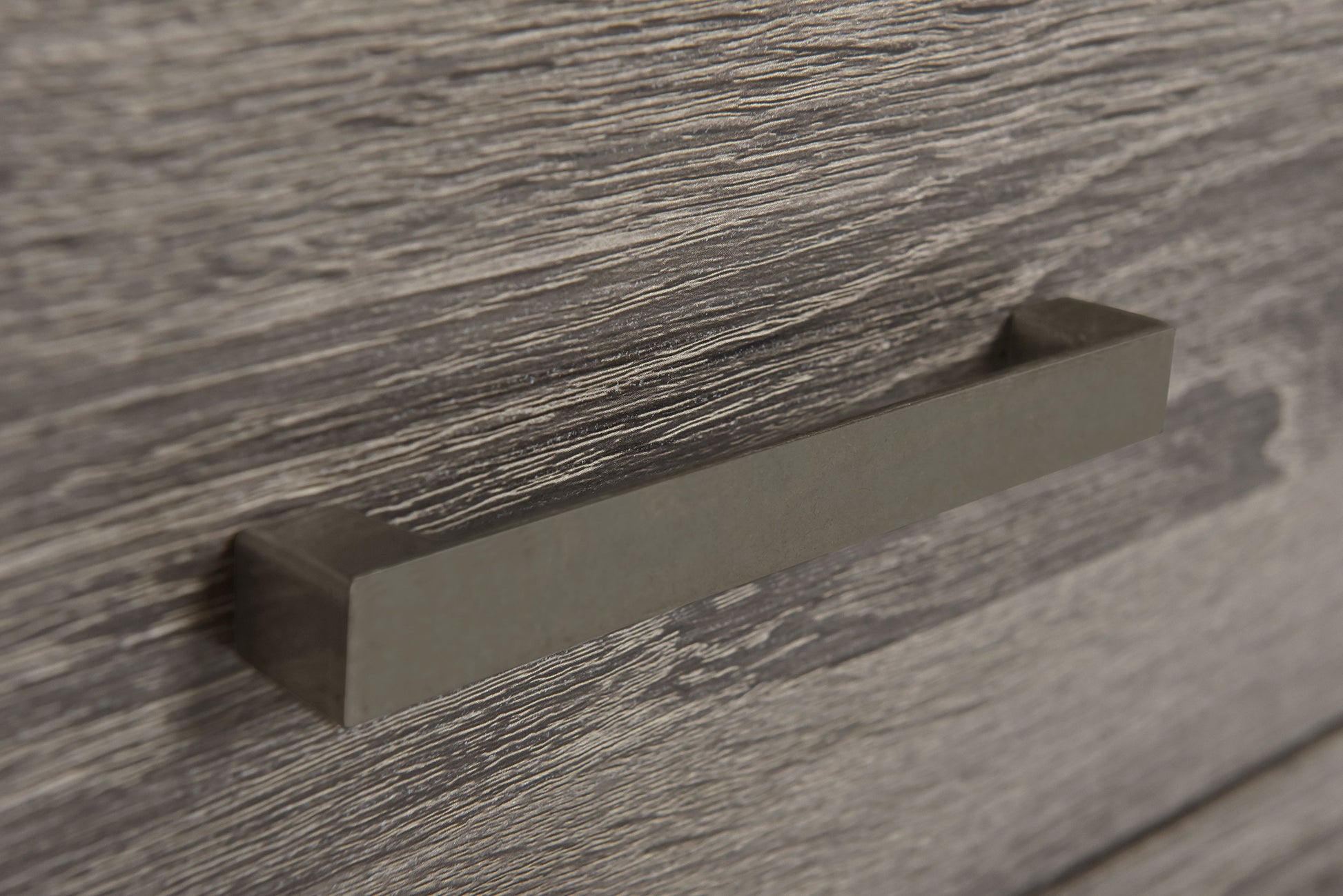 β’ A brown oak wood grain finish is complemented with metal bar handles that add a touch of contrast