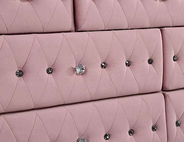 Showcase your personal taste with this bold statement piece in your bedroom. Fully upholstered in flannelette, this dresser features eye-catching tufting. The padded fabric and crystal buttons continue all throughout the drawers. Each drawer handle is made of glistening acrylic crystals, while silver-painted cabriole legs are perfect in bringing in majestic vibes.